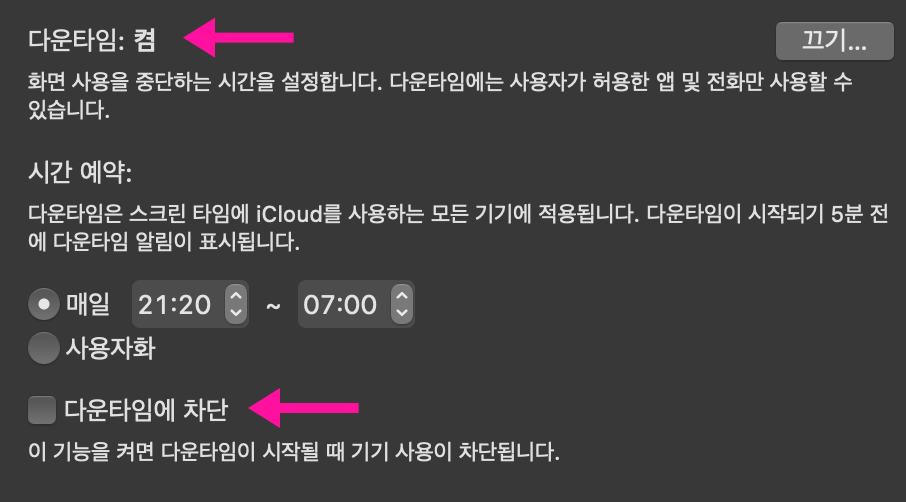 하지만, 다운타임에 차단 기능을 활성화 한 후 다운타임을 켜게 되면, 다운타임이 개시된 후 각 앱에 표시되는 내용이 살짝 달라집니다.
