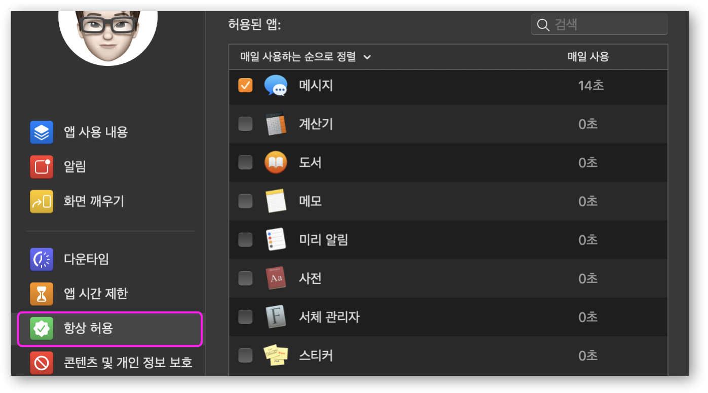 설정 부분은 전체 앱의 사용을 제한하는 "다운타임", 특정 앱의 사용 시간을 제한할 수 있는 "앱 시간 제한", 다운타임의 영향을 받지 않는 앱을 선별적으로 설정할 수 있는 "항상 허용", 콘텐츠 및 개인 정보 보호와 관련된 설정을 할 수 있는 "콘텐츠 및 개인 정보 보호" 메뉴로 구성됩니다.