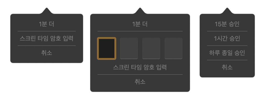 위와 같이 "1분 더" 와 "스크린 타임 암호 입력" 두 개의 메뉴만 선택할 수 있게 되며, 암호 입력을 선택하면 암호 입력창이 표시되고, 암호을 입력하고 나면 아래와 같이 "15분 승인", "1시간 승인", "하루 종일 승인" 선택 메뉴 창이 나타나게 됩니다.