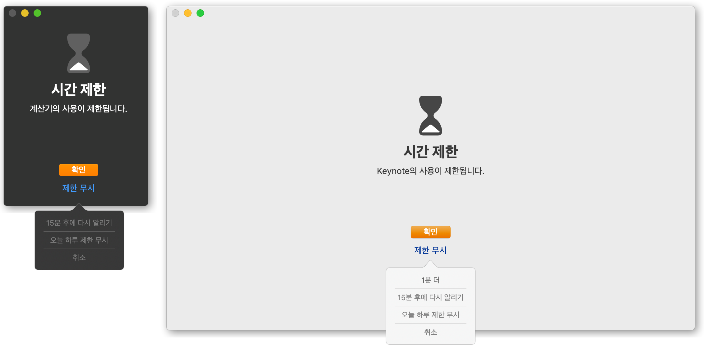 이 기능은 앱의 특성에 따라 달라지는데, 문서작업과 같이 작업을 저장하는 기능이 있는 앱의 경우, 제한 무시에 "1분 더" 메뉴가 추가됩니다. 이것은 다운타임으로 화면이 잠겼지만, 작성중인 문서를 저장할 시간을 갖기 위한 것으로 "1분 더"를 선택하게 되면, 1분 동안 화면 잠김이 해제되므로, 이 사이에 작업중인 문서를 저장할 수 있습니다.