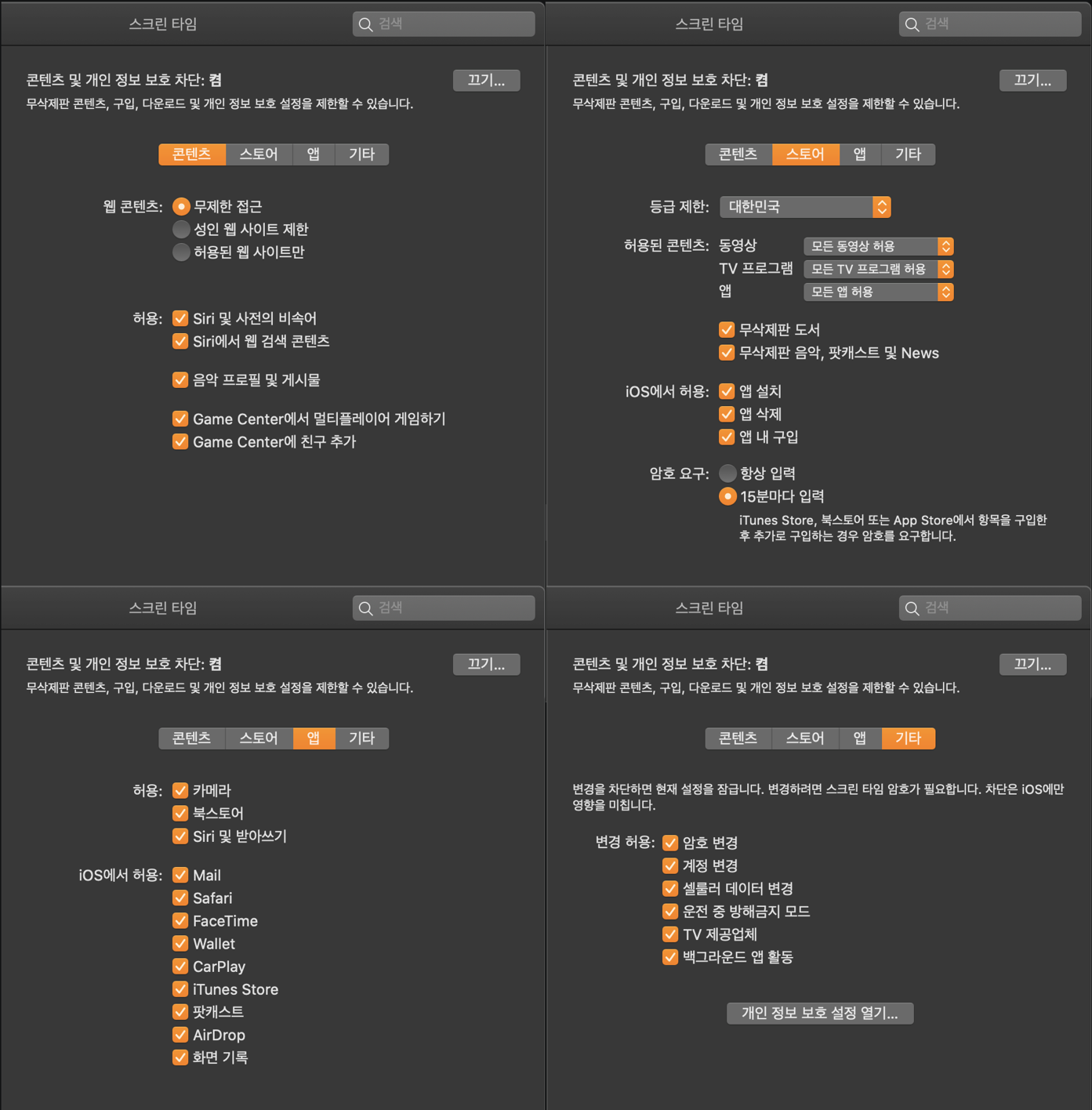 앞서 언급했듯이, 스크린 타임은 부모가 자녀의 컴퓨터 사용 습성을 파악하고, 사용 권한 제한을 통해 컴퓨터 및 앱 사용시간을 제한하거나 불 건전한 컨텐츠에 노출되거나, 무분별한 유료앱 및 콘텐츠 구매를 방지하기 위한 기능이라고 할 수 있습니다.