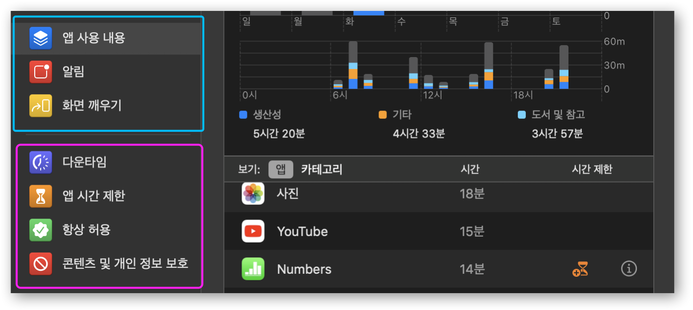 스크린 타임은 크게 두 부분으로 파란박스 부분은 스크린 타임에 의해 수집된 앱 및 웹사이트 사용 로그를 확인하는 부분과 분홍색 박스 부분의 설정 부분으로 나눠 집니다.