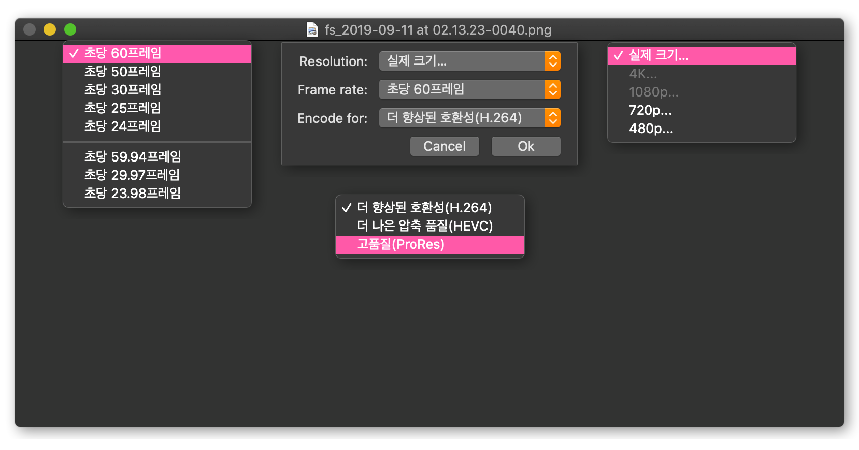 Encoding 방식은 H.264, HEVC, ProRes 이렇게 3종류를 지원합니다.