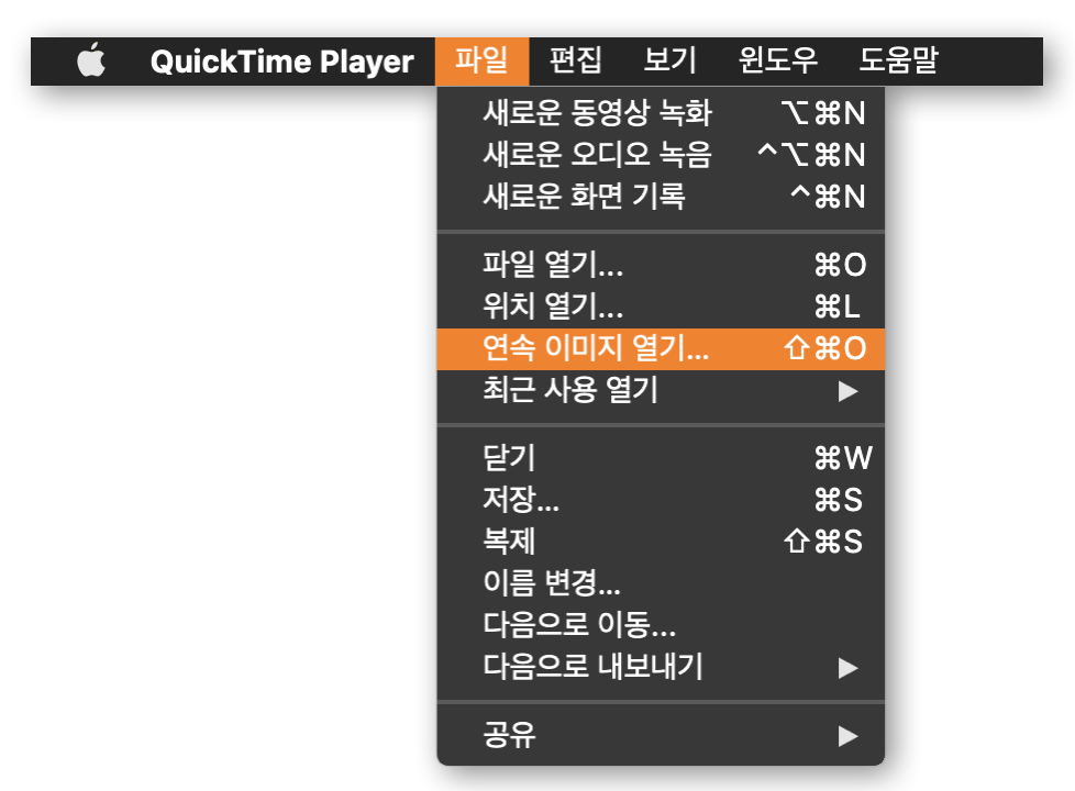 우선 QuickTime Player를 실행 시킨 후, menu 에서 아래와 같이 파일 > "연속 이미지 열기" 를 선택해 줍니다.