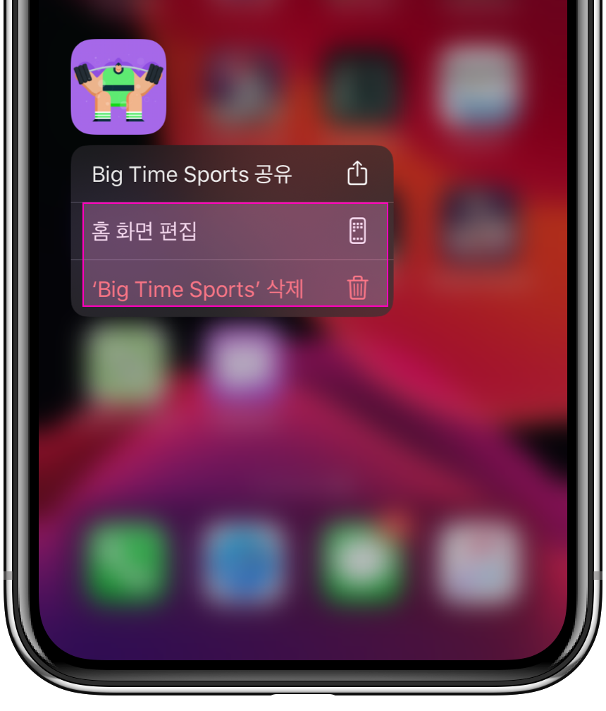 이전까지는 아이콘을 길게 눌러 Contexture menu가 나오면, 여기서 배치를 변경하는 방식이었으나, iOS 13.2 beta 2에서는 아래와 같이 "홈 화면 편집" 과 해당 앱을 삭제할 수 있는 삭제 버튼으로 구분되어 추가된 것을 확인할 수 있습니다.