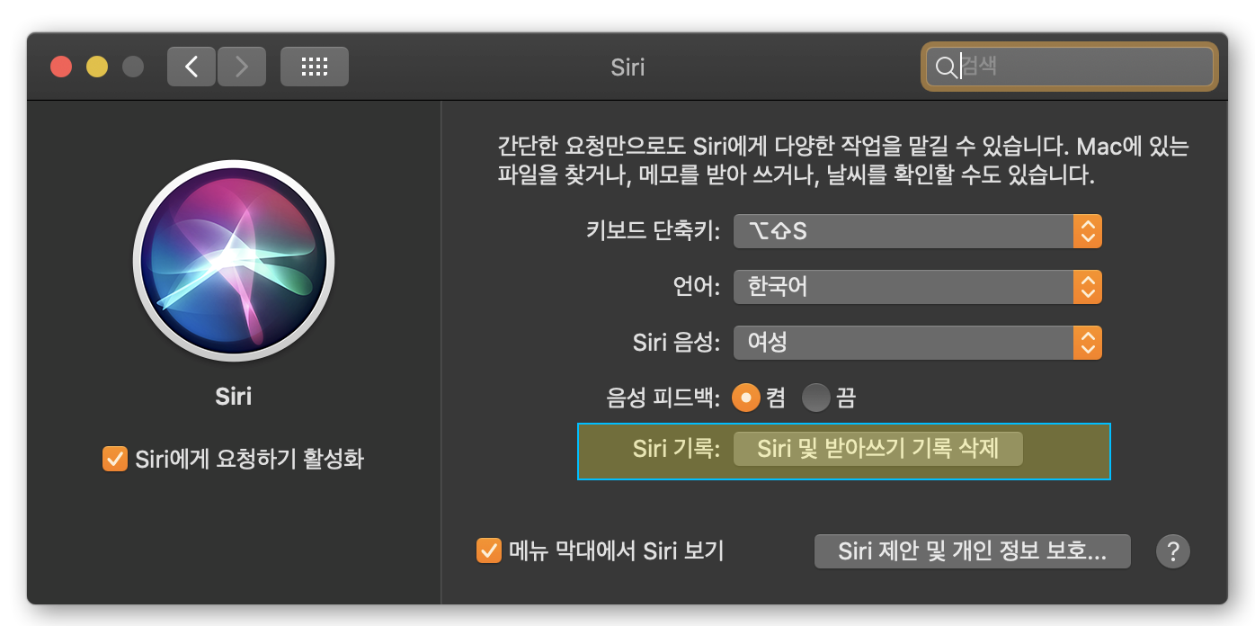 만일 업데이트 후 첫 화면에서 결정한 Siri 오디오 녹음 공유 여부를 추후에 변경하고자 한다면, 시스템 환경 설정 > 보안 및 개인 정보 보호 > 분석 및 향상 에서 "Siri 및 받아쓰기 기능 향상" 옵션을 재 설정하면 됩니다.