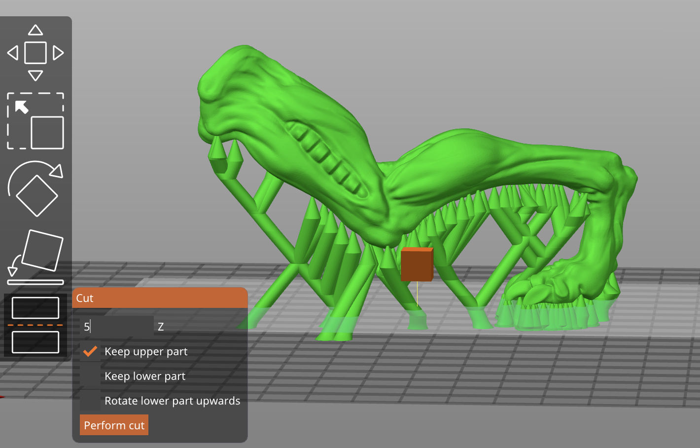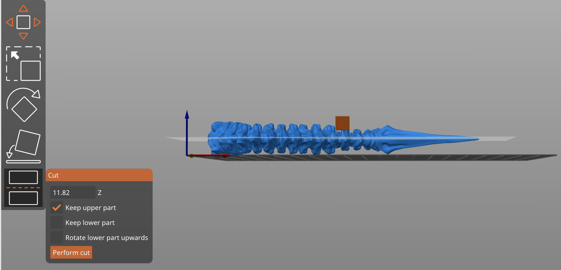 위의 결과를 그대로 사용하여 출력할 경우, 발 바닥 부분에 매우 많은 Tree support를 출력하기 위해 상당히 많은 시간이 소요된다는 점을 예상할 수 있습니다. 따라서, 일단은 Tree Suppport를 만든 위의 결과를 저장한 후, 다시 Slicer로 불러 들여와서, 아래와 같이 강제로 높힌 5mm를 다시 Cut 해주는 작업을 합니다.