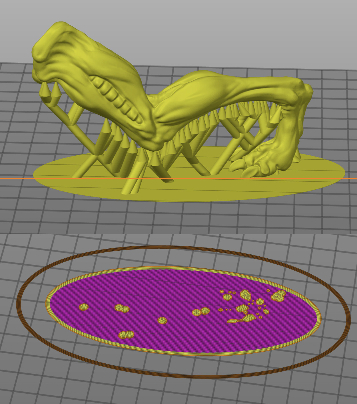 이렇게 하면, 발 바닥을 원래 모델과 마찬가지로 정확히 Bed에 일치시킬 수 있음은 물론, Tree Support를 출력하기 위한 시간을 줄일 수 있게 됩니다. 아래는 5mm를 Cut 하고 난 후의 First Layer 입니다.