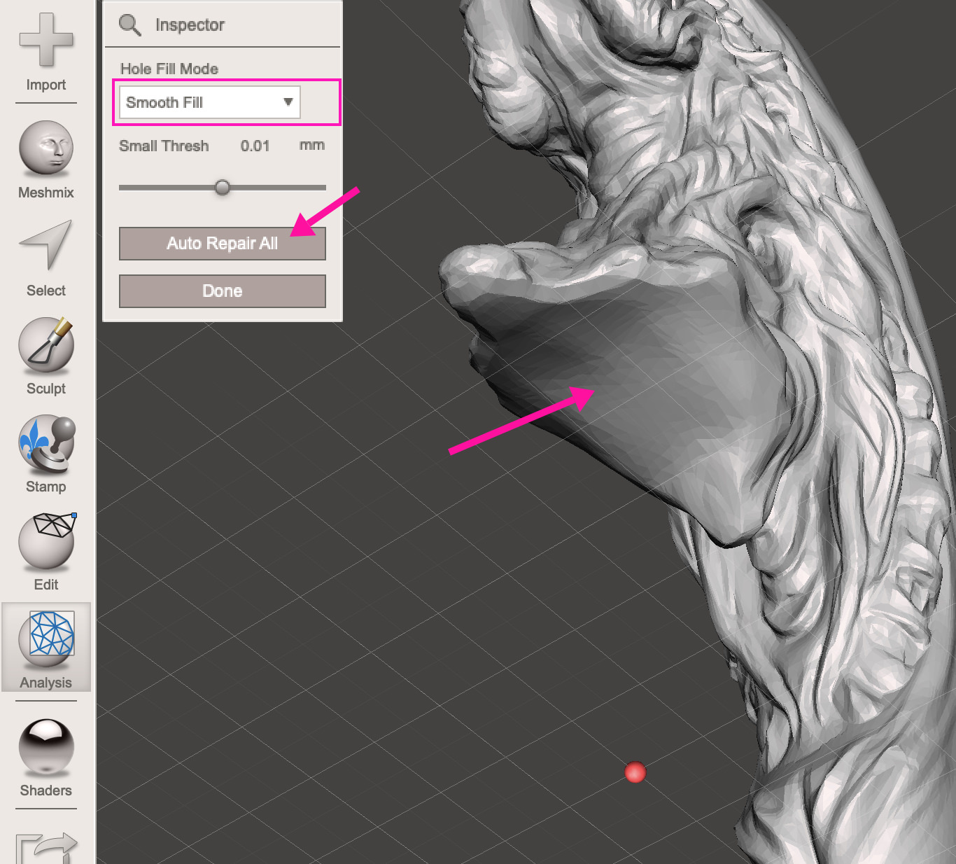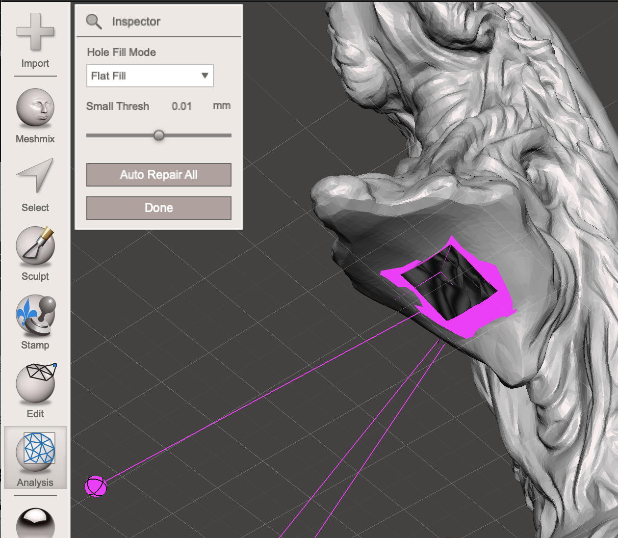 위의 스샷과 같이 Analysis를 선택하고, Inspector를 선택하면 Meshmixer가 자동으로 모델의 결함 부분을 찾고, 표시를 해 주게 됩니다.