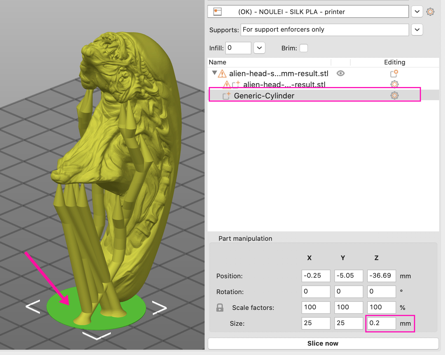 Tree Support와 모델의 First Layer가 매우 작은 Dot 형태로 분포하고 있는 것을 알 수 있습니다. 매우 작은 면적들이기 때문에, 첫 레이어를 출력할 때 문제가 발생할 수 있음은 물론, Support를 출력해 나가면서 떨어질 확률도 높습니다. 따라서, Head 때와 마찬가지로 0.2mm 높이의 Base Object를 아래와 같이 깔아 줍니다.