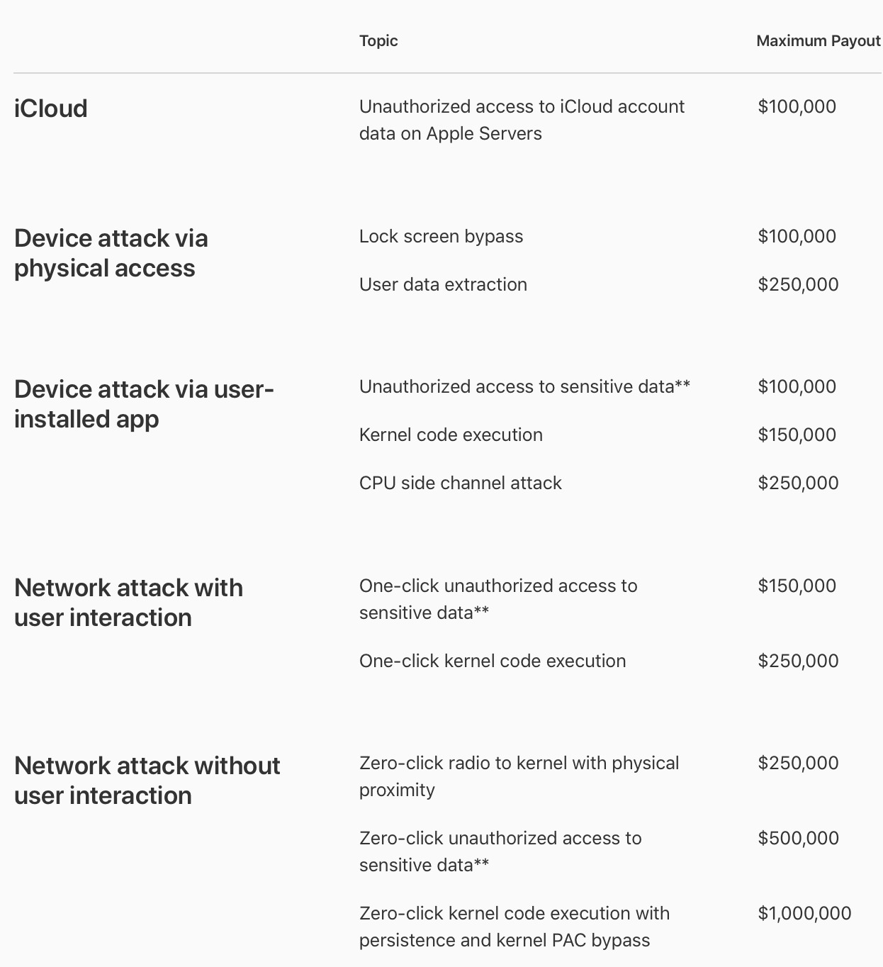이는 보안성 강화가 목적으로, 보안과 관련된 문제가 iOS, iPadOS, macOS, tvOS, watchOS 최신버전과 최신 하드웨어에서 발생해야 합니다. 문제점을 발견한 사람은 Apple에 상세한 보고서를 제출해야 하며, Apple이 보안과 관련되어 공식적인 패치를 공지하기 전에 별도의 채널을 통해 공개해서는 안됩니다.