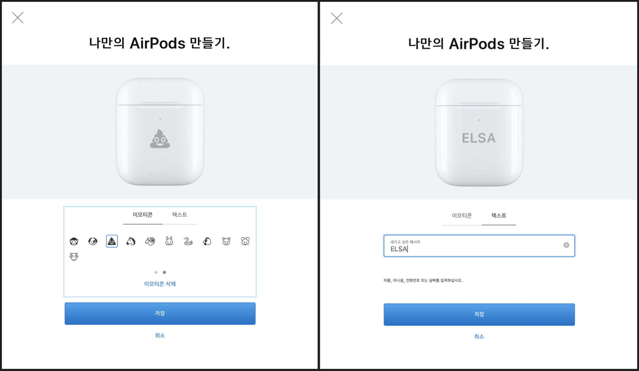 애플 - AirPods, AirPods Pro 케이스 무료 각인 서비스 이모티콘 추가