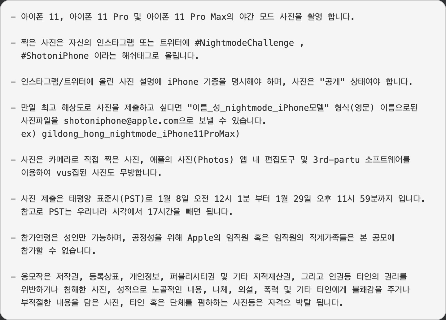 보다 자세한 내용을 원하시는 분은 Apple의 Shot On iPhone 야간 모드 챌린지 공식 규정(한글 PDF 파일)을 확인하시기 바랍니다.