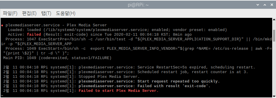 만일, Raspberry Pi를 재 부팅한 후에 plexmediaserver가 동작하지 않는다면, service 상태를 확인해 봐야 합니다.