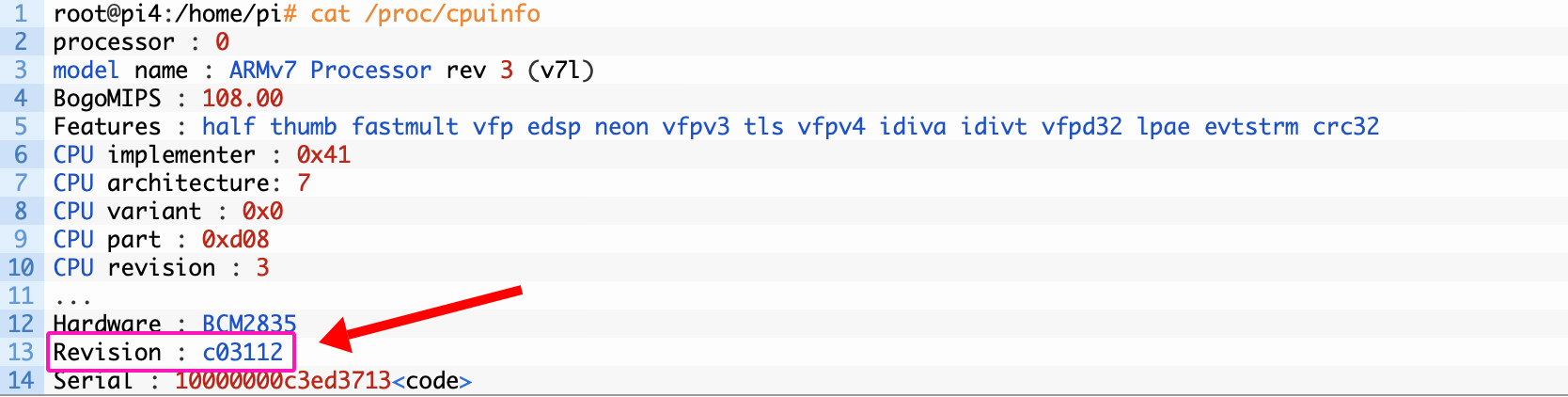 두 번째 방법은 설치된 리눅스 터미널에서 CPU Information 정보를 확인하는 방법으로 아래 스샷과 같이 cat /proc/cpuinfo 명령의 결과에서 Revisoin 정보가 c03112로 확인된다는 점 입니다. 기존 RPi 4B의 a03111과 비교가 됩니다. 앞의 a,b,c는 메모리 용량(1GB, 2GB, 4GB)를 의미하므로 뒤의 숫자 03112로 식별할 수 있습니다.