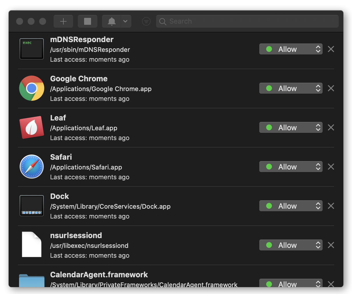 Firewall에 등록된 앱이나 프로세서들은 menu bar의 firewall 아이콘에서 Open Firewall 메뉴를 통해 위와 같은 화면에서 각 앱/프로세서의 네트워크 접근여부를 재 설정할 수도 있습니다.