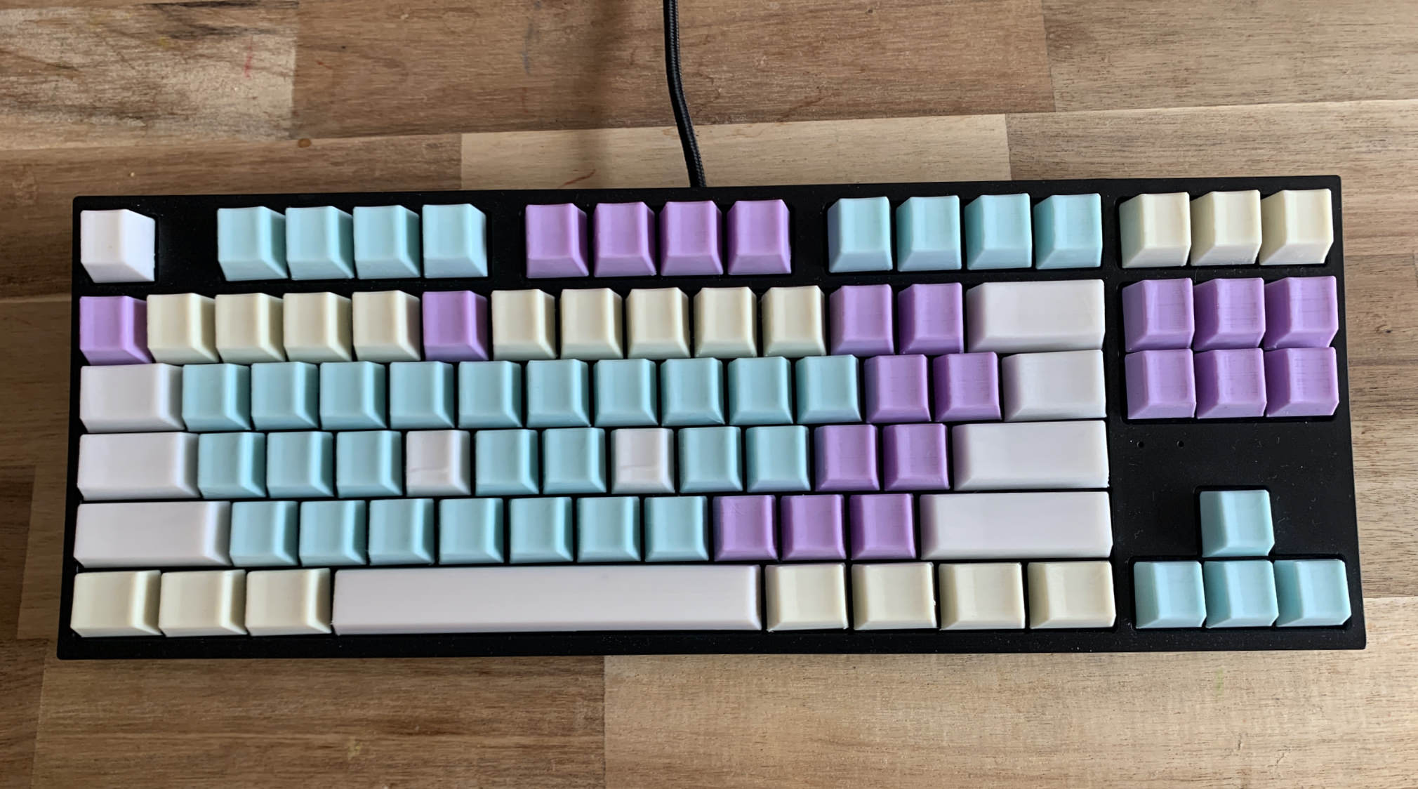 기본 키캡 1개 출력이 대략 15분 정도 걸리니.. 87키 출력하는데 대략 23시간 정도 소요되는 셈입니다 . 정확히 확인해 보지는 않았지만, 토요일/일요일 이틀 동안 주구장창 출력했습니다. 덕분에 그 동안 안 쓰고 방치되어 있던 짜투리 필라멘트들 유용하게 잘 쓴듯..