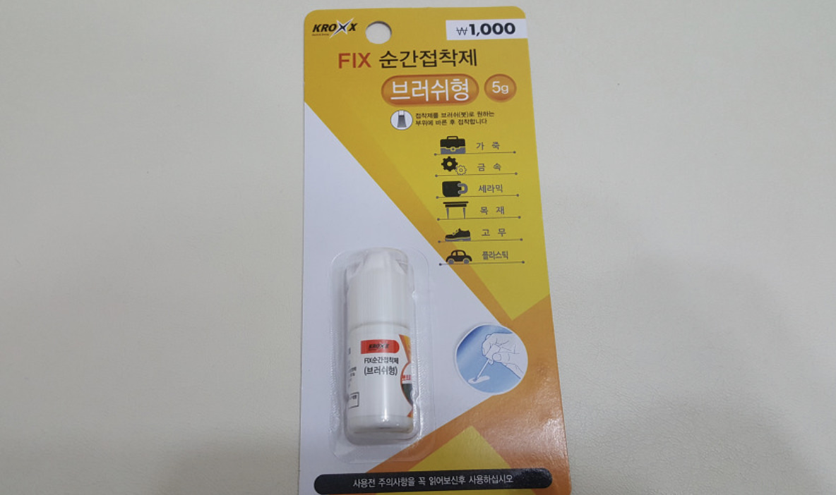 순간접착제와 사포는 가까운 다이소에서 쉬게 구하실 수 있는데, 접착제는 위에 보시는 바와 같이 브러쉬형이 작업하기 좋습니다. 충분히 촉촉하게 발라주고, Pin을 붙힌 후에는 1시간 정도 충분히 말려 주는 것이 중요 합니다. 완전히 마르지 않은 상태에서 키 스위치에 연결하면 스위치에 영향을 줄 수 있습니다.
