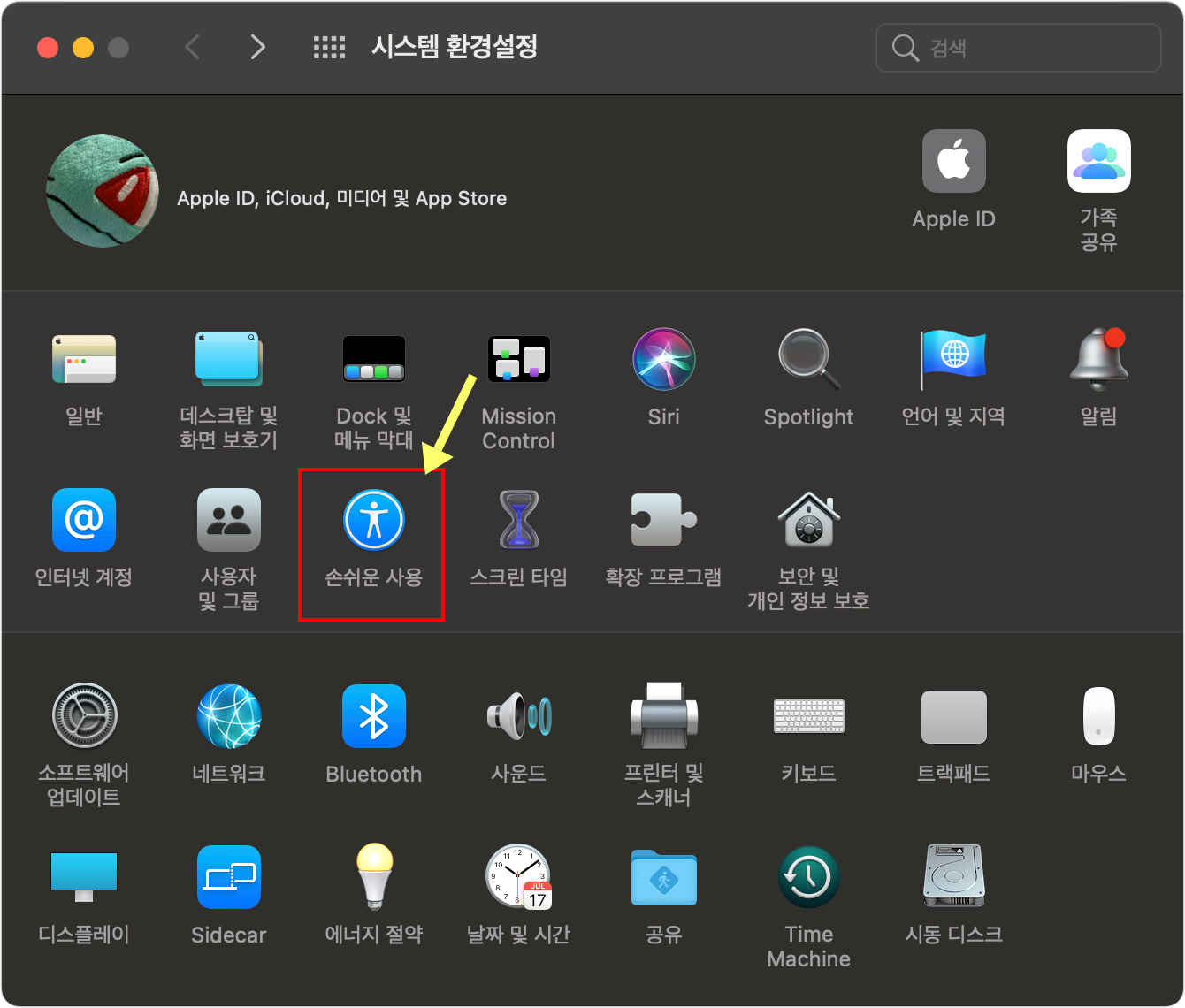 우선, 시스템 환경설정에서 "손쉬운 사용"으로 들어 갑니다.