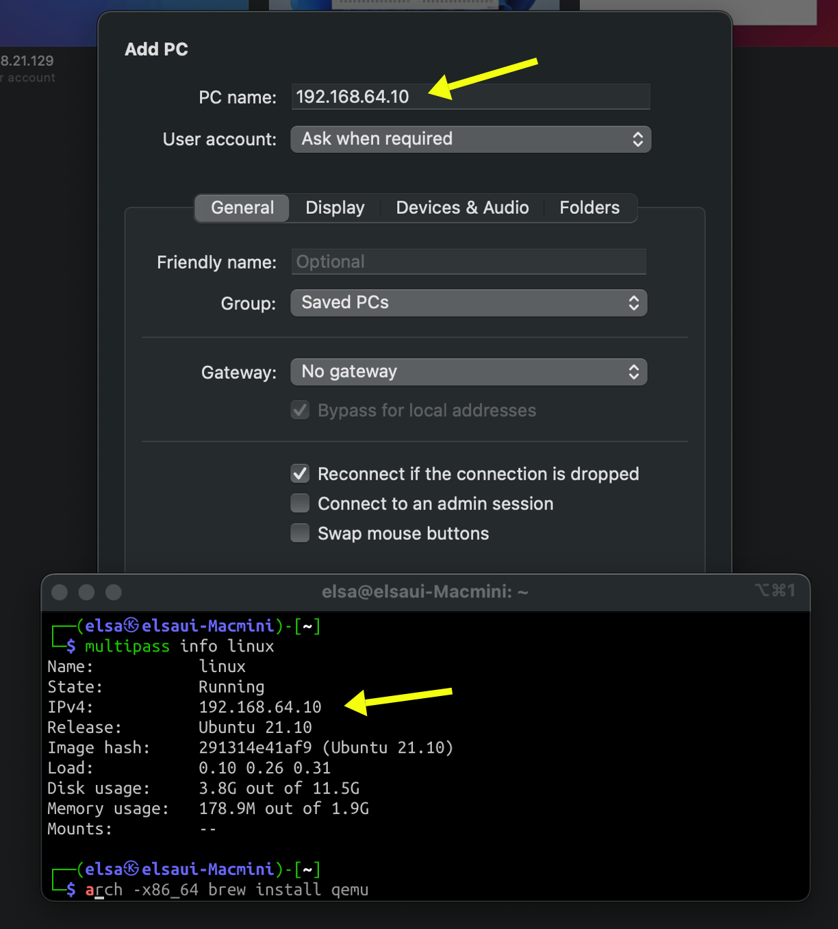 앞서 살펴 본 바와 같이 host terminal에서 multipass info linux 로 해당 VM에 할당된 Ip address를 확인한 다음, Remote Desktop app의 PC name에 넣어 주고, 오른쪽 하단의 Add 버튼을 눌러 추가해 줍니다.