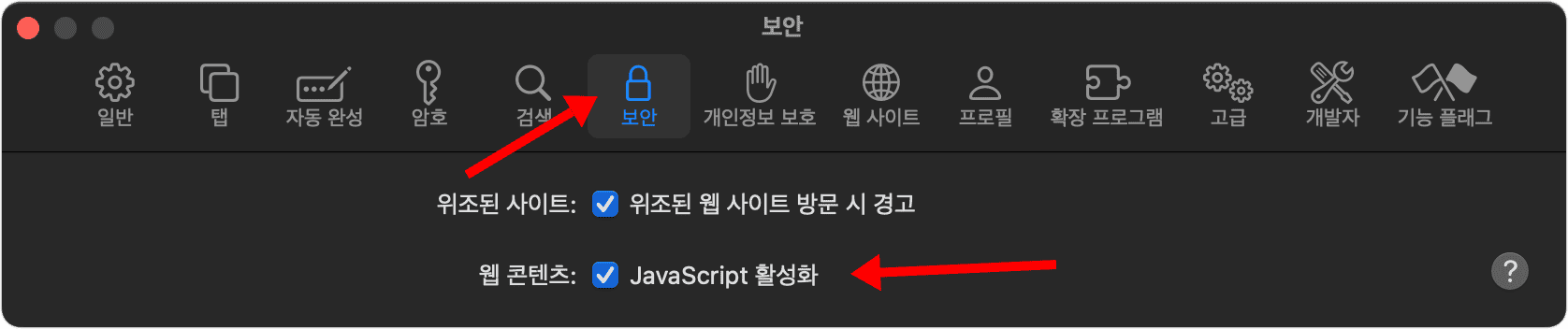 위의 스샷에서 보는 바와같이 메뉴에서 "Safari" > "설정" > "보안" 항목 밑에 위치합니다.