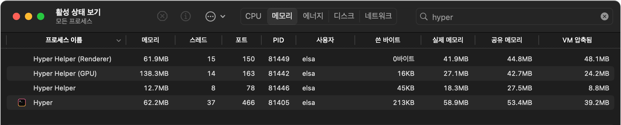 일단 단일 터미널을 띄웠을 때를 보면, 윗쪽 스샷은 iTerm2, 아래는 Hyper 입니다. iterm은 대략 190MB 정도 이지만, Hyper는 Render, GPU, Helper 등등의 프로세스가 함께 실행되어, 대략 270MB 정도의 리소스를 사용합니다.
