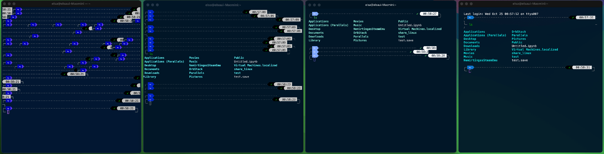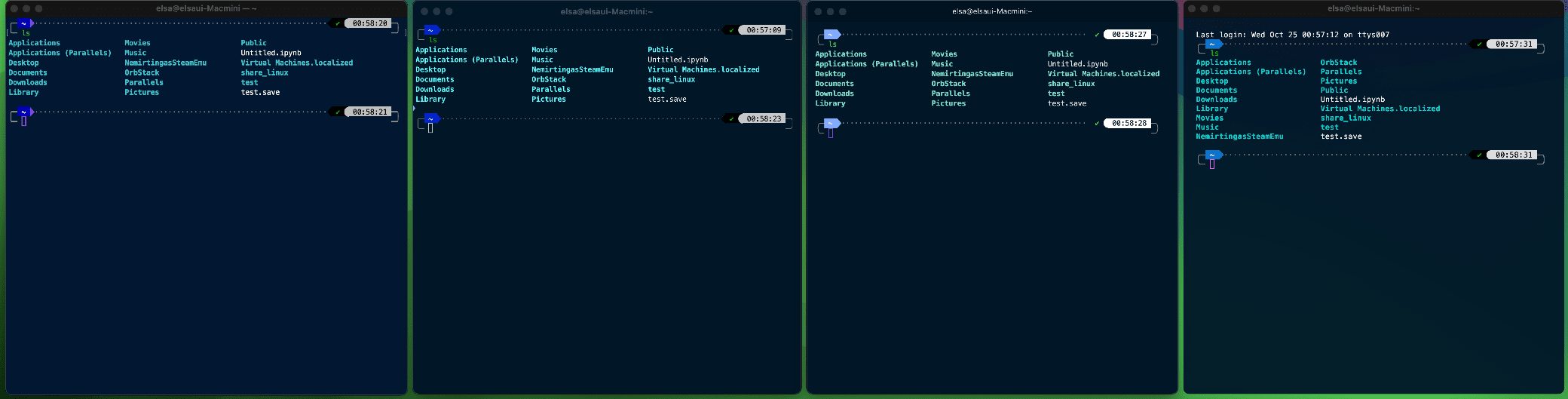 아래는 각 터미널에서 ls 명령을 내린 직 후의 스샷 입니다. 가만히만 놔두고 쓰면 다들 문제없이 깔끔합니다.