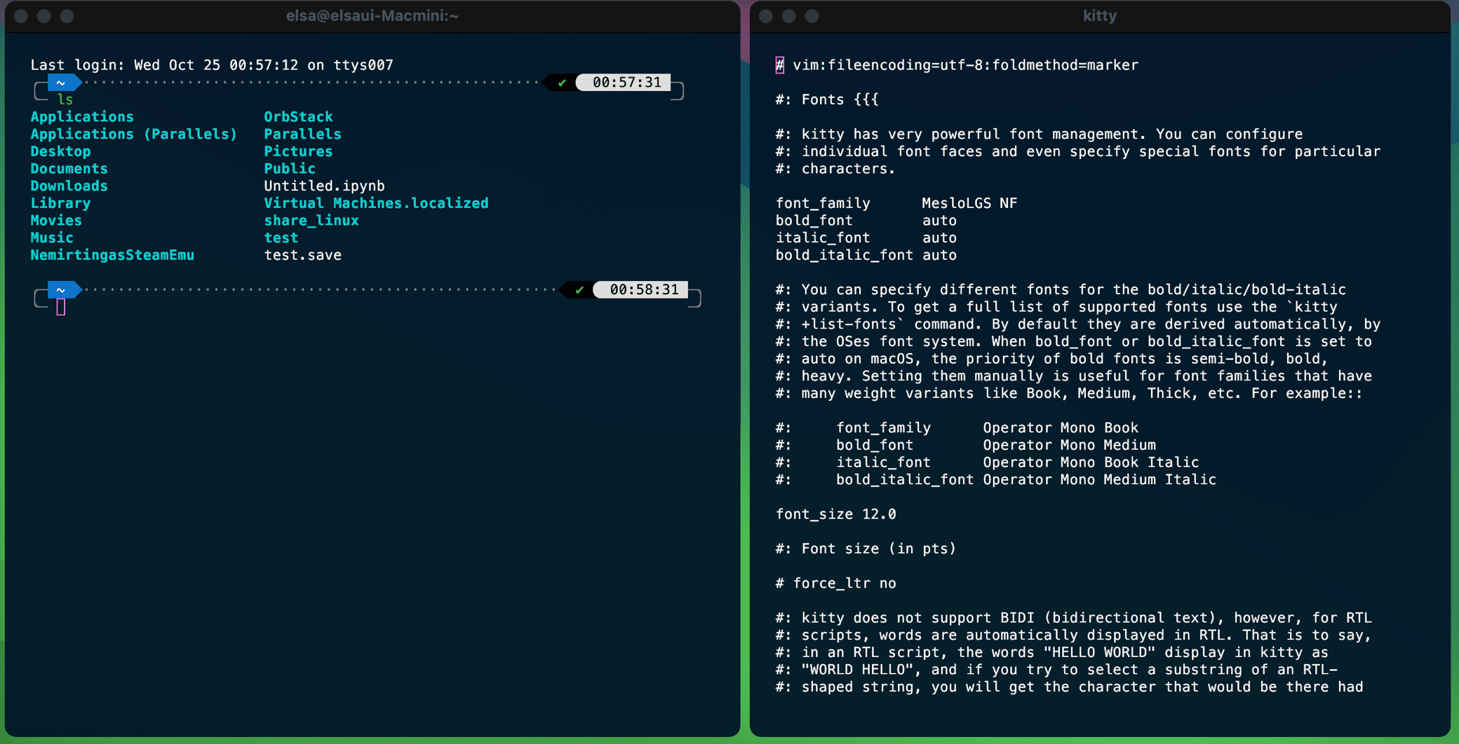 위의 스샷에서 처럼 메뉴에서 해당 메뉴를 선택하여 반영할 수도 있고, 단축키인 Ctrl+Cmd+,(콤마) 를 kitty 터미널이 활성화 된 상태에서 눌러줘야 합니다. 몇몇 항목들은 reload를 해줘도 반응이 없는데, 그 때는 앱을 종료 한 후, 다시 실행하면 반영이 되어 실행 됩니다. 요..요.. 요런게 좀... 하지만, 이건 한 번 설정하면 건드릴 일이 거의 없기 때문에, 처음에만 고생하면 되니 큰 불편함은 아니겠지요.