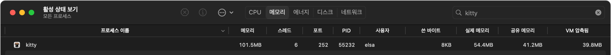 리소스는 단일 터미널 런칭 기준으로 100MB 좀 넘는 수준입니다 Hyper와는 비교가 안되고, iTerm2의 절반 정도 수준입니다.