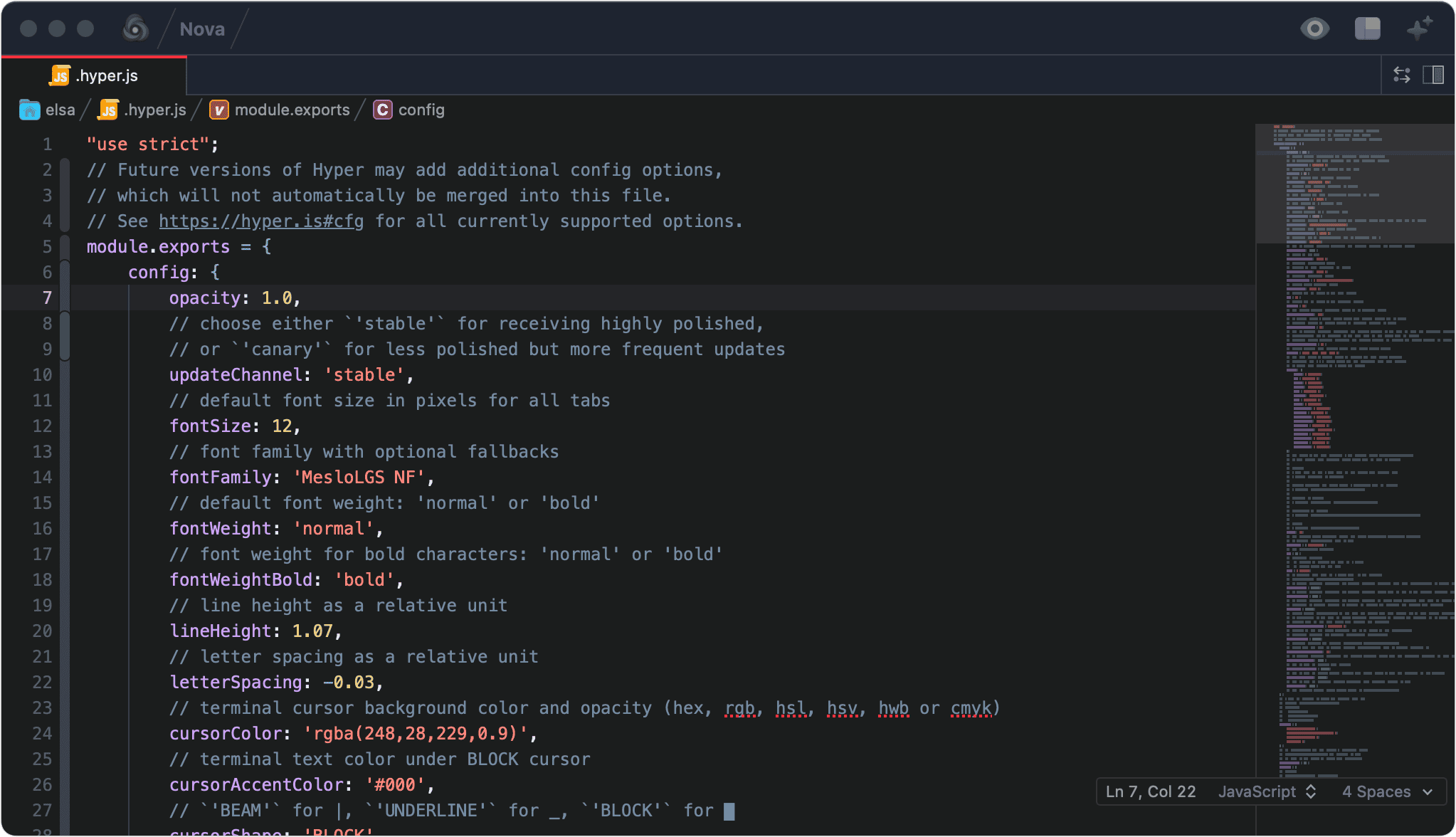 GUI 인터페이스를 사용하지만, Cross-Platform 앱이기에, 설정 메뉴를 선택하면 아래와 같이 설정 스크립트가 뜹니다. 처음 사용하시는 분들은 살짝 당황할 수 있는 부분이죠. 하지만, 항목 수가 매우 적고 각 설정에 대한 comment를 잘 달아놨기 때문에 설정은 쉽게 변경할 수 있습니다. 설정 옵션을 변경하고, 저장을 하는 것 만으로 실시간 적용이 되기 때문에 직관적으로 옵션을 변경할 수 있습니다.