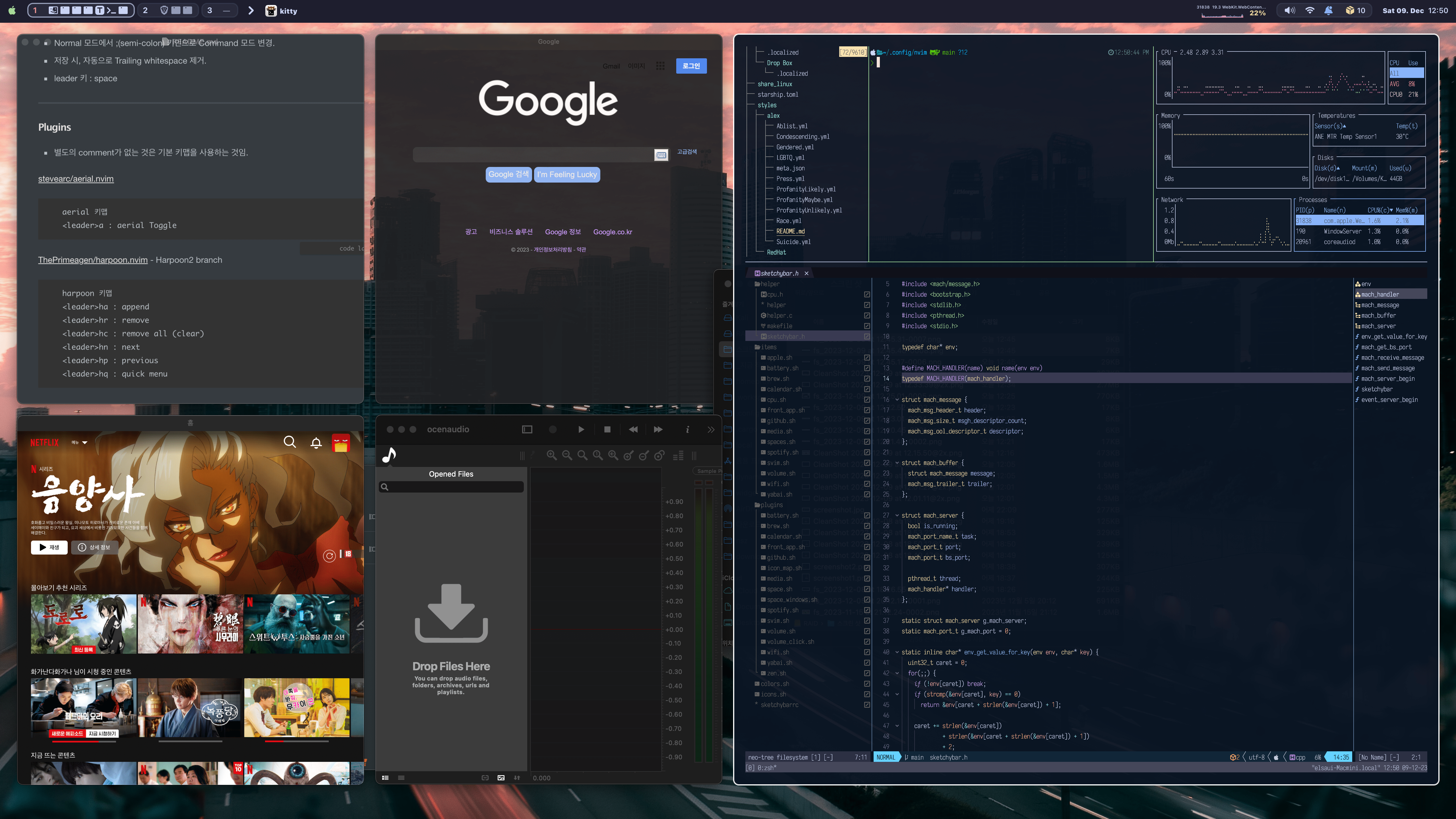 yabai 기반에 simple-bar를 이용하던, sketchybar를 사용하뎐 지향점은 macOS 환경을 탈피하여 보다 Linux like한 환경을 구축한다는 것에 있습니다. 과거 Linux UI/UX 환경은 Windows나 macOS의 그것에 비해 뒤쳐져 있었지만.. 최근의 상황은 그렇치 않습니다.