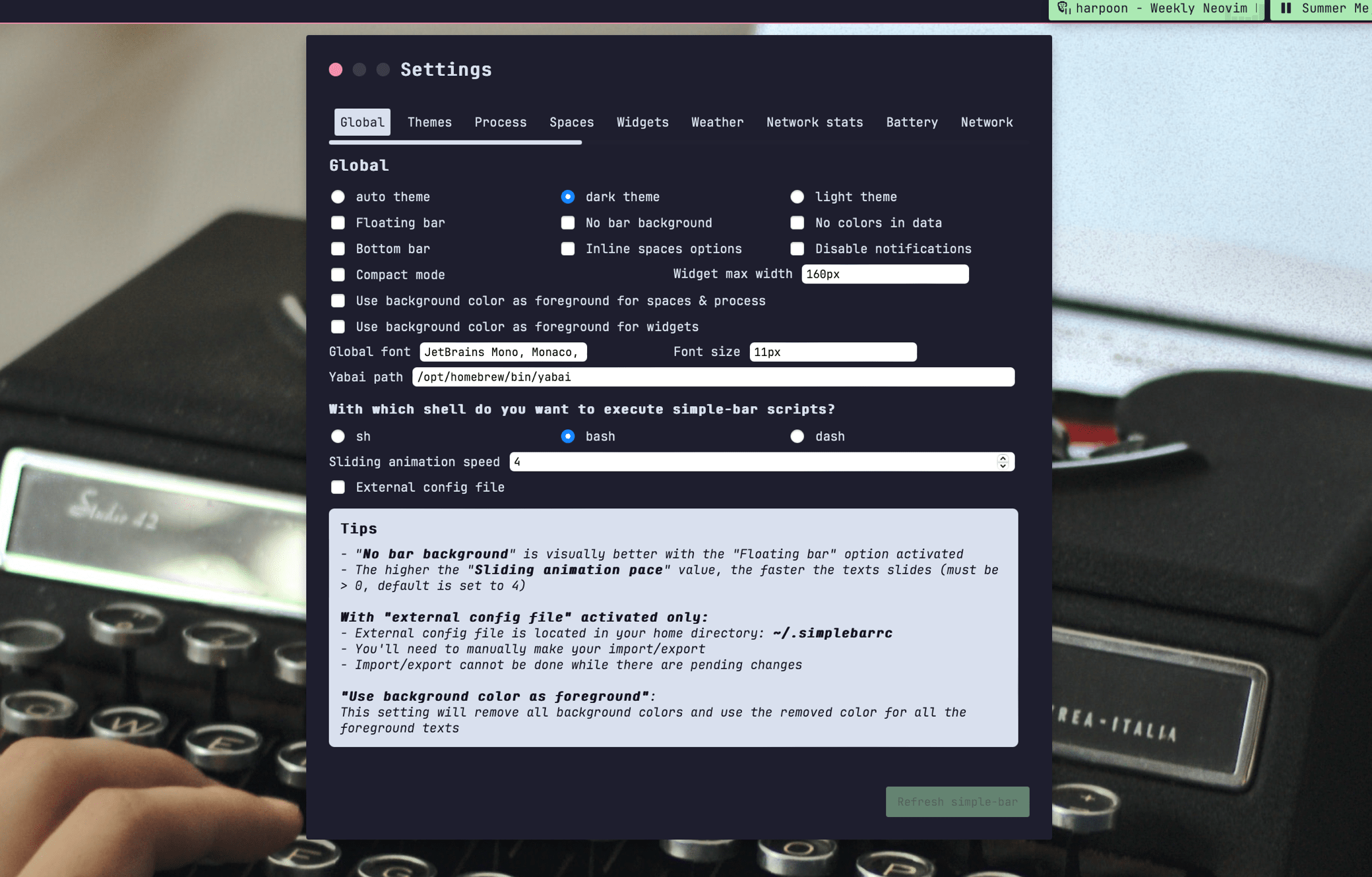simple-bar는 배경화면에 custom UI를 표시할 수 있는 Ubersicht의 widget 입니다.