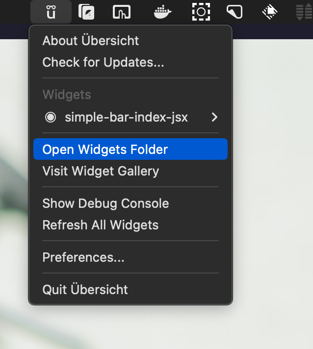 압축해제 후 폴더명을 simplebar로 변경하고, Uberschit의 Widgets Folder를 연 다음, simplebar 폴더를 Widgets Folder에 복사하면 됩니다. Uberschit의 widgets folder는 아래 스샷처럼 menu bar에서 Uberschit 아이콘을 클릭한 후, Open Widgets Folder를 선택하면, Finder가 열리게 됩니다. 반대로, 설치를 제거하고 싶다면 그냥 해당 폴더에서 simple-bar 폴더를 제거하면 됩니다.
