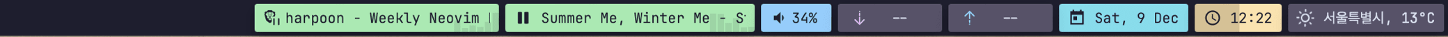 status bar의 왼쪽에는 현 space에서 실행 중인 application들에 대한 정보를 제공하며, 왼쪽에는 webbrowser, apple music/spotify 정보, 볼륨 정보 및 제어, 날짜, 날씨, 시계 등의 정보를 표시합니다.
