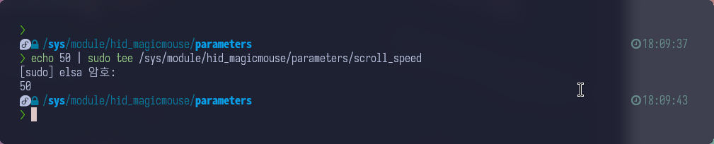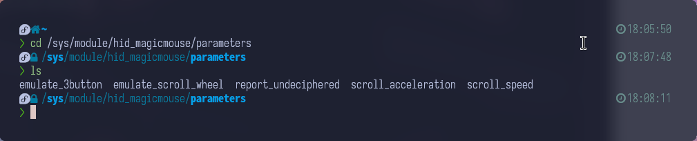 각 parameter의 값을 변경하는 방법은 /sys/module/hid_magicmouse/parameters 로 이동하면,