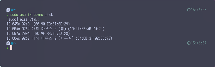 아래와 같이 sudo asahi-btsync list 명령을 내리면, 현재 macOS의 bluetooth에서 관리되고 있는 Bluetooth 목록이 나타나게 됩니다.