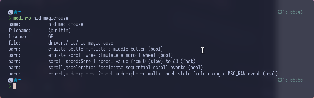 다음은 scroll speed와 scroll acceleration 값을 변경하는 방법을 알아 보겠습니다. magic mouse의 driver는 이미 kernel 4.1x에서 빌트인되었습니다. multi-touch 기능에 대한 설정은 아직은 잘 모르겠지만, scroll speed와 scroll acceleration 사용 여부등을 옵션을 설정할 수 있도록 되어 있지요.