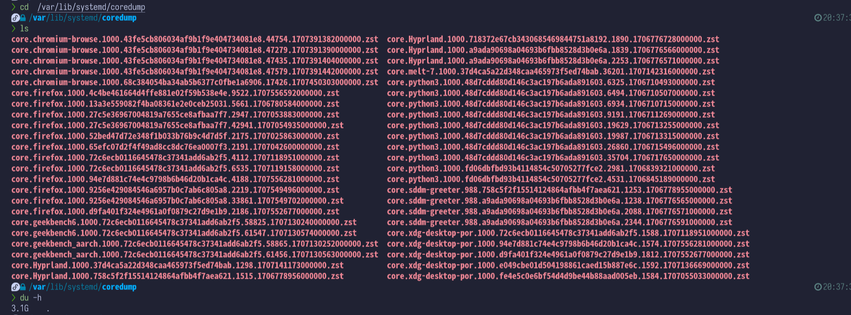 fedora의 경우, /var/lib/systemd/coredump 폴더에 특정 프로세스의 core dump 파일을 저장하고 있는 경우가 있습니다. 프로세스 core dump는 실행 중에 오류가 발생하거나, 비정상적으로 종료를 시킨 경우 혹은 프로세스가 crash 된 경우 디버깅을 위해 해당 프로세스의 정보를 저장하는 것입니다. core dump 는 일반적으로 매우 큰 사이즈의 정보를 저장하게 됩니다 아래는 예 입니다.