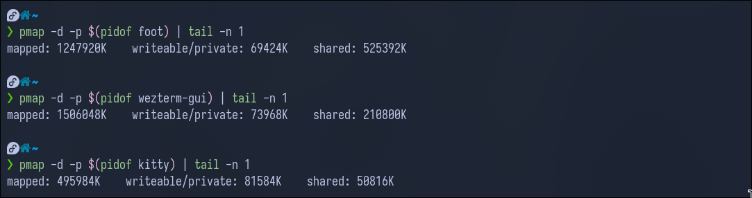 익히 그 존재는 알고 있었고, macOS에서 잠깐 사용했었지만.. 사용하지는 않았습니다. macOS에서는 kitty를 사용했었죠. Wezterm의 장점은 kitty와 foot의 장점을 모두 갖고 있다고 할 수 있습니다. GPU 가속기능을 사용하면서, 메모리 점유율은 Kitty 보다 작고, Foot 보다는 약간 높습니다. 성능과 자원소모 모든 면에서 타협할 수 있는 수준입니다.