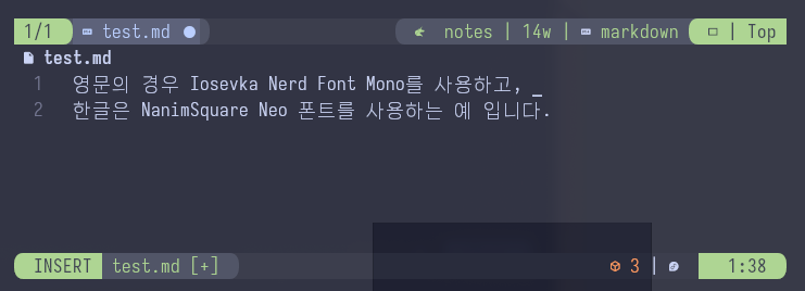 위의 예는 영문의 경우 Iosevka Nerd Font Mono를 사용하고, 한글은 NanumSquare Neo 폰트를 사용하는 것을 알 수 있습니다.