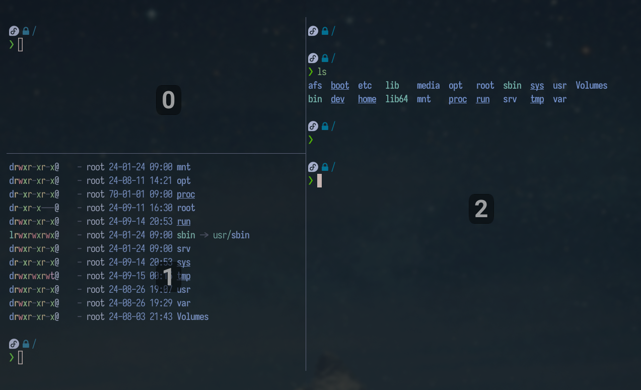 앞선 포스트에서도 언급했듯이, wezterm의 가장 강력한 장점 중 하나는 자체적으로 multiplexer 기능을 갖추고 있다는 점 입니다. 이는 tmux를 대처할 만큼 강력하고 편리합니다. 10여년 이상 tmux를 사용해 온 필자도 wezterm을 기본 터미널로 사용하기 시작하면서 tmux를 내렸습니다.
