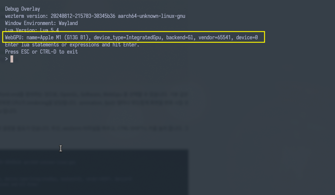 여기서, 자신이 GPU 환경에 정확히 설정할 필요가 있습니다. 우선, wezterm 터미널을 띄우고, CTRL-SHIFT-L 키를 눌러 줍니다. 그럼 화면이 아래와 같이 변경됩니다.