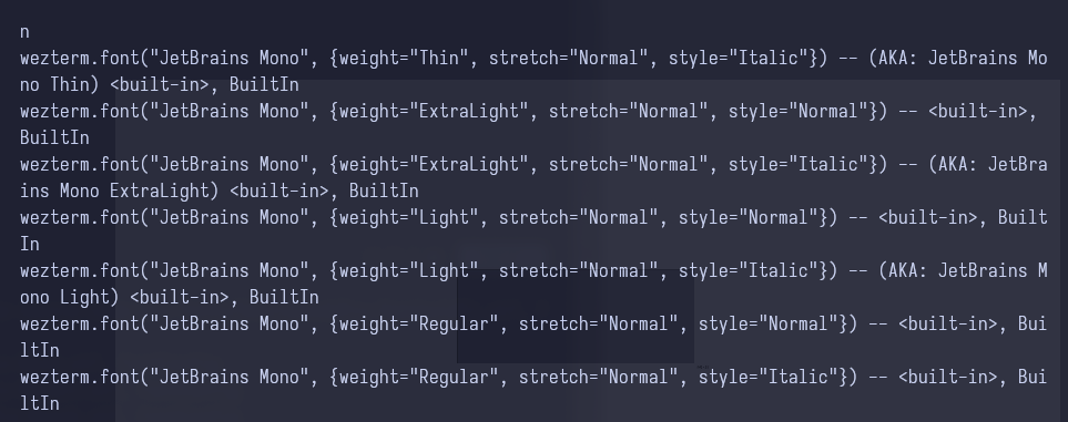 font 이름은 terminal 에서 wezterm ls-fonts --list-system 명령으로 확인할 수 있습니다.
