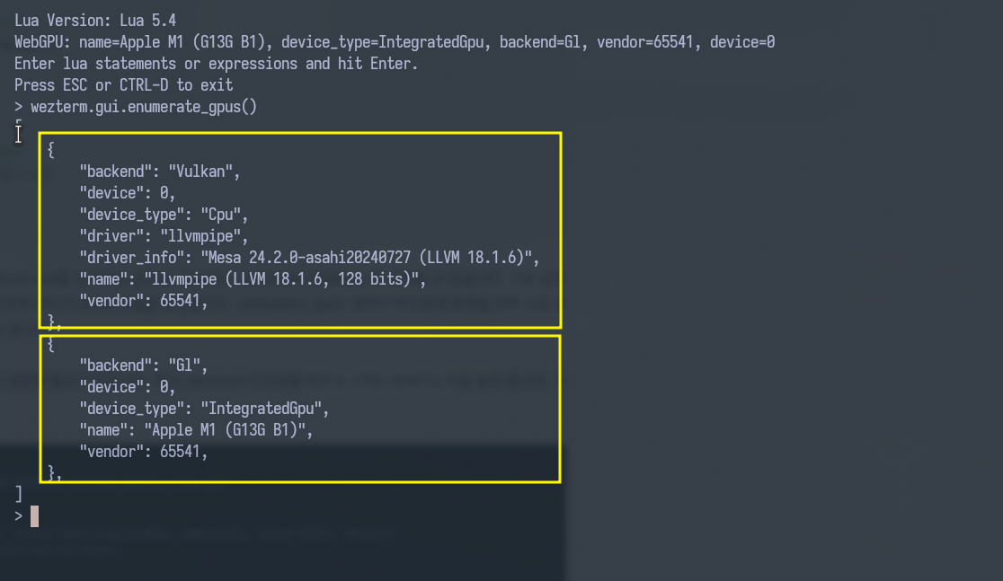 프롬프트에 wezterm.gui.enumerate_gpus() 를 키인하고 enter키를 처 줍니다. 그럼, 아래와 같이 wezterm이 인식한 GPU Device에 대한 목록이 나오게 됩니다.