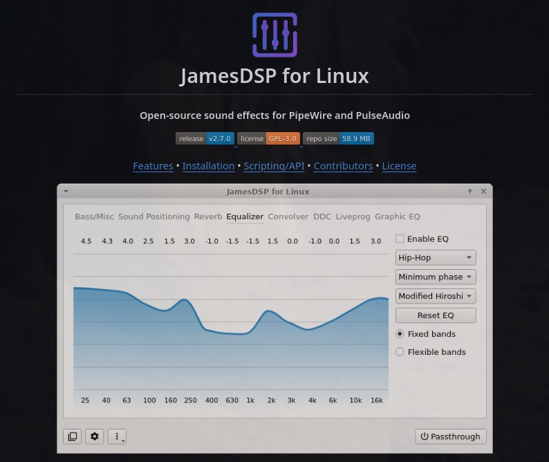 처음 살펴 볼 것은 Linux의 Audio 출력에 다양한 음장효과 및 Parametric Equalizer 기능을 사용할 수 있는 JamesDSP for Linux 입니다.