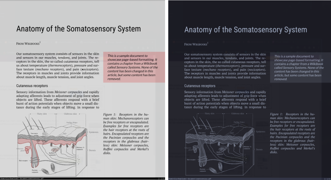 이 뷰어가 갖는 가장 큰 장점은 PDF 파일을 원하는 색상 theme 특히, dark mode로 읽을 수 있다는 점입니다.