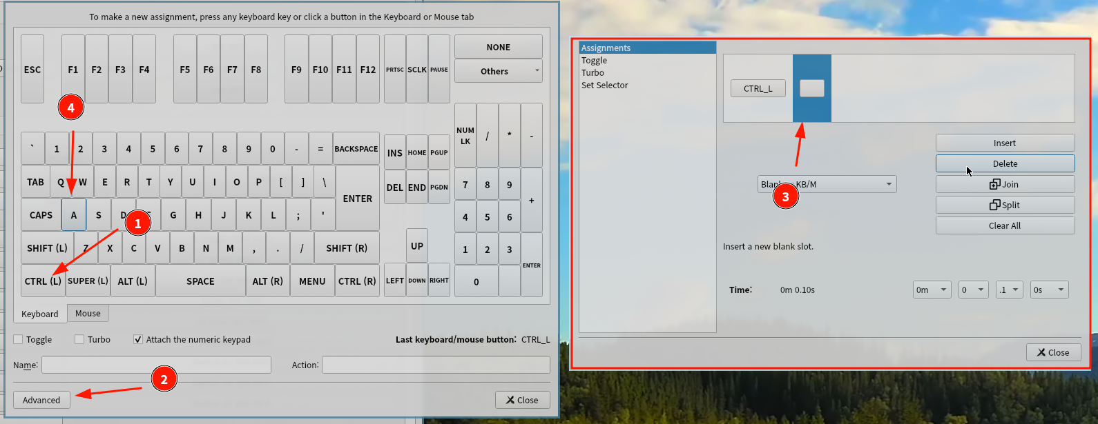 단일 키를 맵핑할 때는 예를 들자면 위의 스샷처럼 F1을 선택하고, 그냥 close 버튼을 누르면 됩니다. 하지만, 예를 들어 CTRL+A 를 맵핑한다고 하면, 아래의 스샷처럼 CTRL (L) 을 선택한 후, 창의 좌측 하단의 Advanced 버튼을 눌러 줍니다.