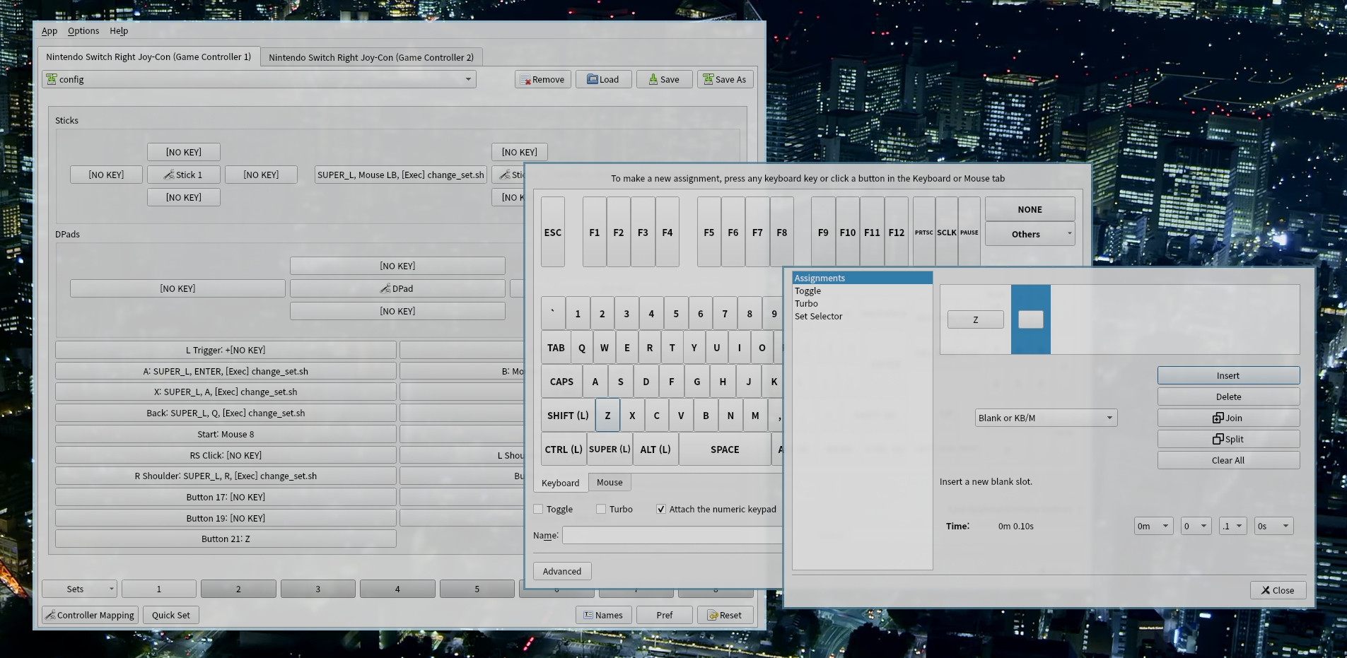 외부에서 antimicrox 옵션으로 set을 변경하거나 IPC 같은 인터페이스를 지원해서 위부 GUI 에서 set을 변경하는 기능이 있으면 더 좋을 텐데, 아직은 이러한 기능을 지원하지 않다 보니, set을 변경하려면 해당 기능을 위해 일부 버튼을 할애해야만 하는 문제도 있지요. 이 문제는 사용자들의 요구도 있고 하니 차츰 개선 되리라 봅니다.