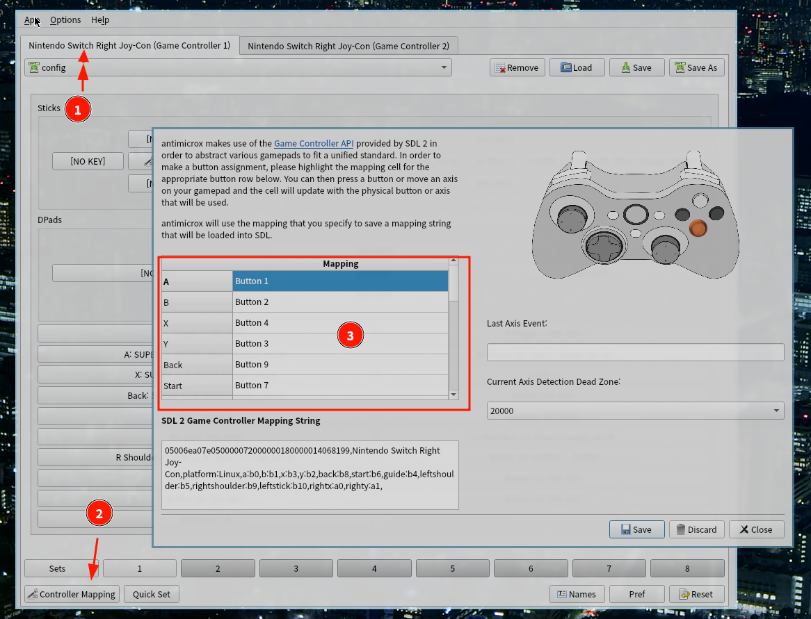 가장 먼저 할 일은 당연히 컨트롤러를 블루투스로 LInux에 연결하는 것이고, 이 상태에서 antimicrox를 실행 한 후, 연결된 장치의 창을 열고(1), 창 좌측 하단의 Controller Mapping을 통해 해당 컨트롤러의 키들을 모두 기본 mapping 해 줘야 합니다. 매우 다양한 컨트롤러를 지원하기 때문에, 어떤 키들은 반응을 하지 않는 것처럼 보이는데, 이는 기본 키 mapping이 누락되어 있기 때문입니다. 따라서, 모든 키들을 일단 등록하는 절차를 걸쳐야 합니다.