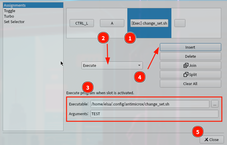 다음 칸을 선택하고(1), dropbox 에서 Execute를 선택한 후(2), Execute program 설정 칸이 표시되면 실행할 파일과 인자를 설정해 준 후(3), Insert를 눌러야(4) 비로소 설정이 되게 됩니다. 만일 argument 나 executable 의 내용을 바꾼다면, 변경 후 반드시 Insert 버튼을 눌러 반영을 해 줘야 합니다.